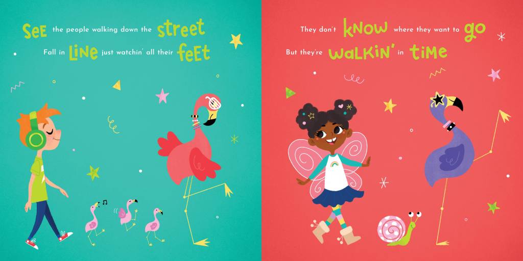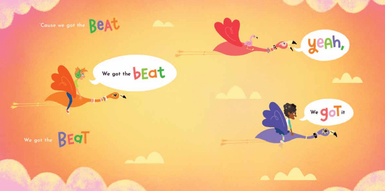Shea: There was a list of several songs I could choose from, but I chose βWe Got the Beatβ in a heartbeat. I felt like the bright, poppy 80s girl band vibe would really let my illustration style shine. I also wanted to incorporate hand-lettering in the book, and there are some really fun, punchy phrases in this song.