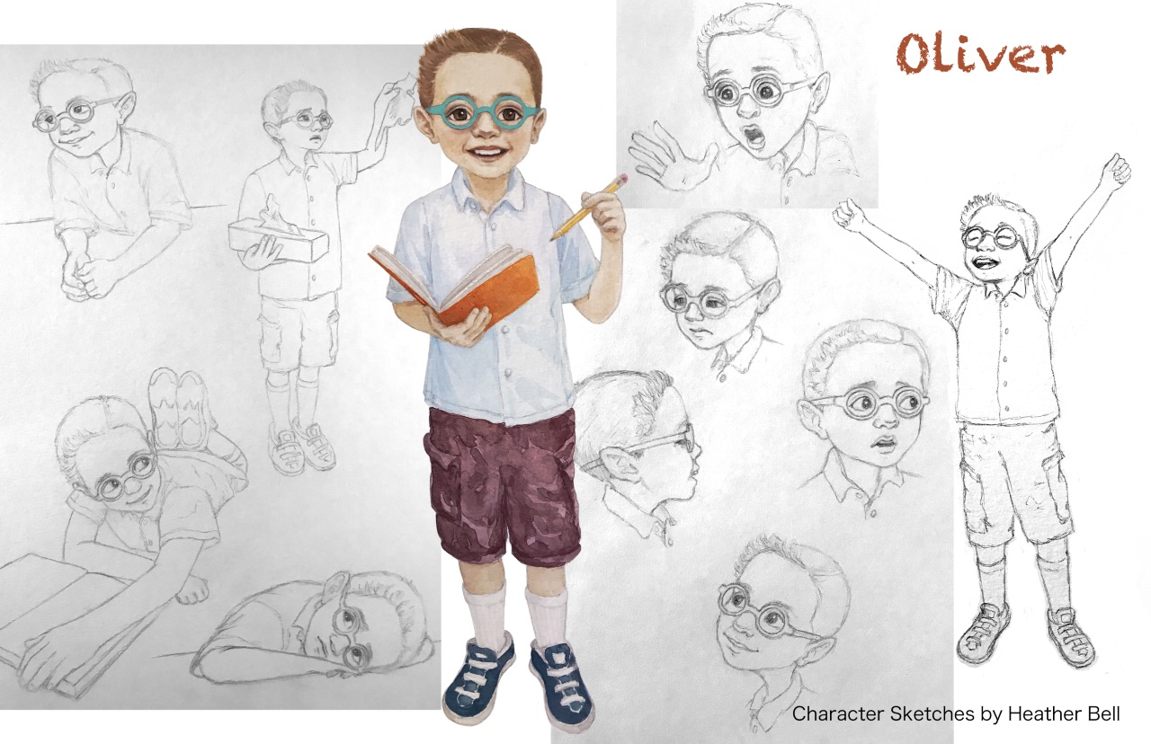 Jolene: After signing the contract with Callie, she and Mira began looking for an illustrator. I was so excited when I saw the character sketches Heather created! I tried really hard to not envision the characters much because I wanted to leave the images to the illustrator, but when I saw Heatherโs character sketches, itโs like she reached in my mind and plucked the characters out. She is so amazingly talented. We did communicate a bit to talk about the age of Oliver and things like that, and Mira and/or Callie would host video conferences to go through the layout and make suggestions about the art and text.ย