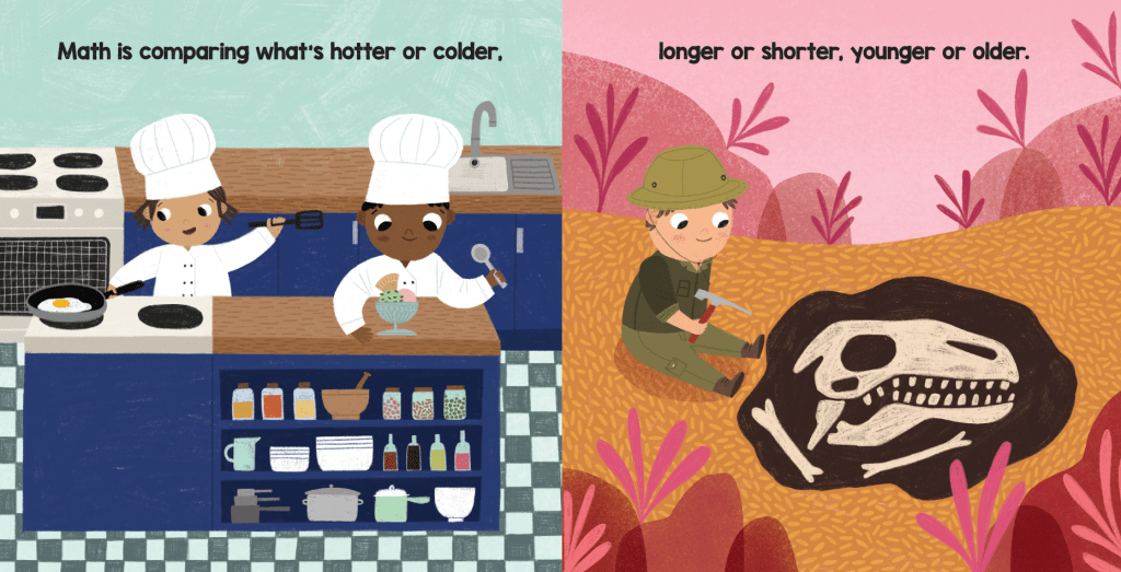 Kaitlyn: That’s the best! I totally agree, big words are how kids learn vocabulary, your agent and editor just earned super points from me! Now, I have to say the cooking and archeology spread is my favorite in Brilliant Baby Does Math! Did you put the paleontology aspect in art notes?