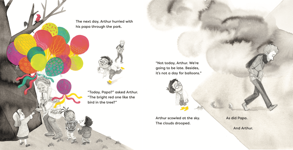 I have suffered from mild bouts of depression in my life, the first ones being after the births of my two children. One vivid memory was when my newborn daughter was crying inconsolably one day and I had tried everything to soothe her, but nothing was working. I was exhausted and struggling to keep it all together. What I remembered the most was not how deeply sad I was or how out of control I felt – it was the genuine compassion of my very young son asking if I was okay and if he could help. That simple, small gesture let me I know I wasn’t alone and that someone cared at that very moment. Another instance was a few years ago when my husband was diagnosed with stage 3 colon cancer – we reeled as a family. One day shortly after my husband’s diagnosis, my daughter turned as she got out of the car at school and said – “Mom, I’m here. I’ll be strong for all of us, especially for Dad.” Then, she turned and trotted into school. I had written a few drafts of ARTHUR/BALLOONS prior to my husband’s diagnosis. Aside from the tears welling up at her sheer strength, it was her empathy and hopeful outlook that solidified Arthur’s character and the storyline for me.