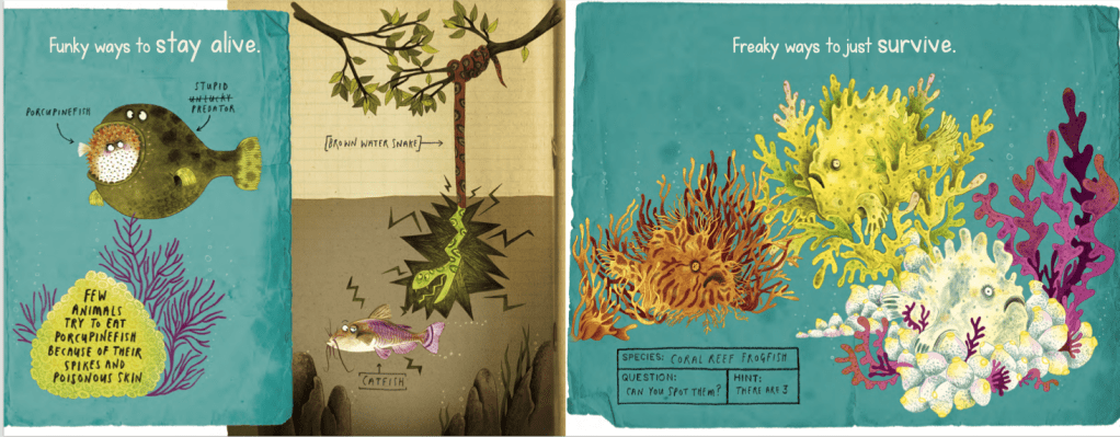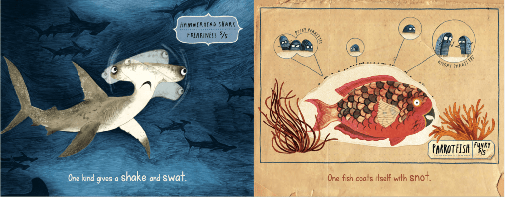 Debra: Claire Powell created the art for this book and I am so thrilled with her illustrations! When I saw the colored sketches for the first time, I couldn’t stop smiling. Each fish and each spread has personality, I couldn’t be happier. They were so much fun! The Freaky and Funky ratings on the pages were her idea and they make me giggle every time I open the book.