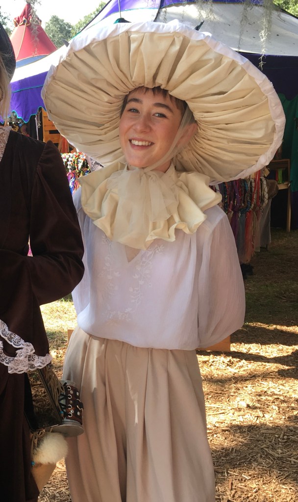 Jamie: Sure, featured here are three types of mushrooms. Can any mycophiles recognize them? For those that don’t, they are the birch bolete (bottom left), pink oyster (top left) and shaggy parasol (on the right). We decided as a group to include the parasol mushroom because it looked like a “dancing princess”, and the other two I chose for their shape and color. The larger blue flowers you see are moon flowers, which open up under the night light of the moon. I was inspired to include these because they grow all along the trail that I run on early in the mornings.