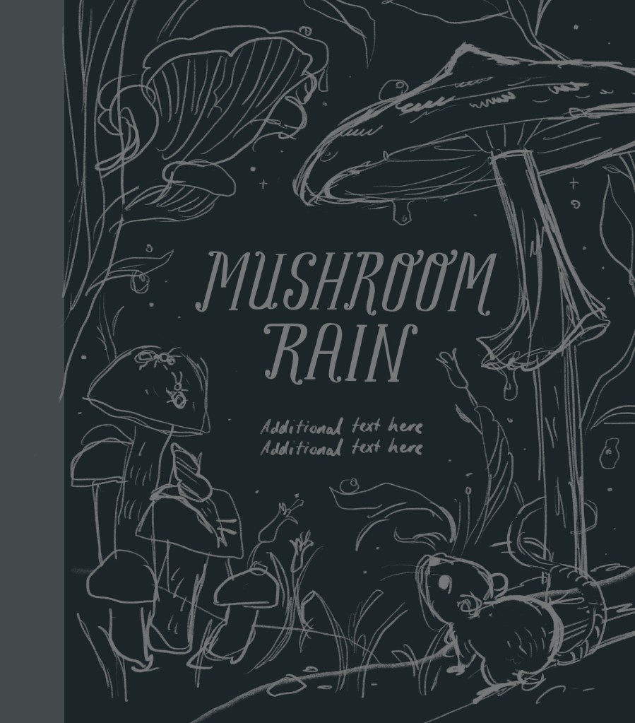 Jamie: Originally I had fully illustrated a cover design but had this gut feeling of “this isn’t quite it”. I decided that I should follow that gut feeling and scrapped the whole thing, without batting an eye! What came next was the actual MUSHROOM RAIN book cover which I think can best be described as gentle yet dramatic! It features our stars of the show–mushrooms–as well as some things that…crawl.